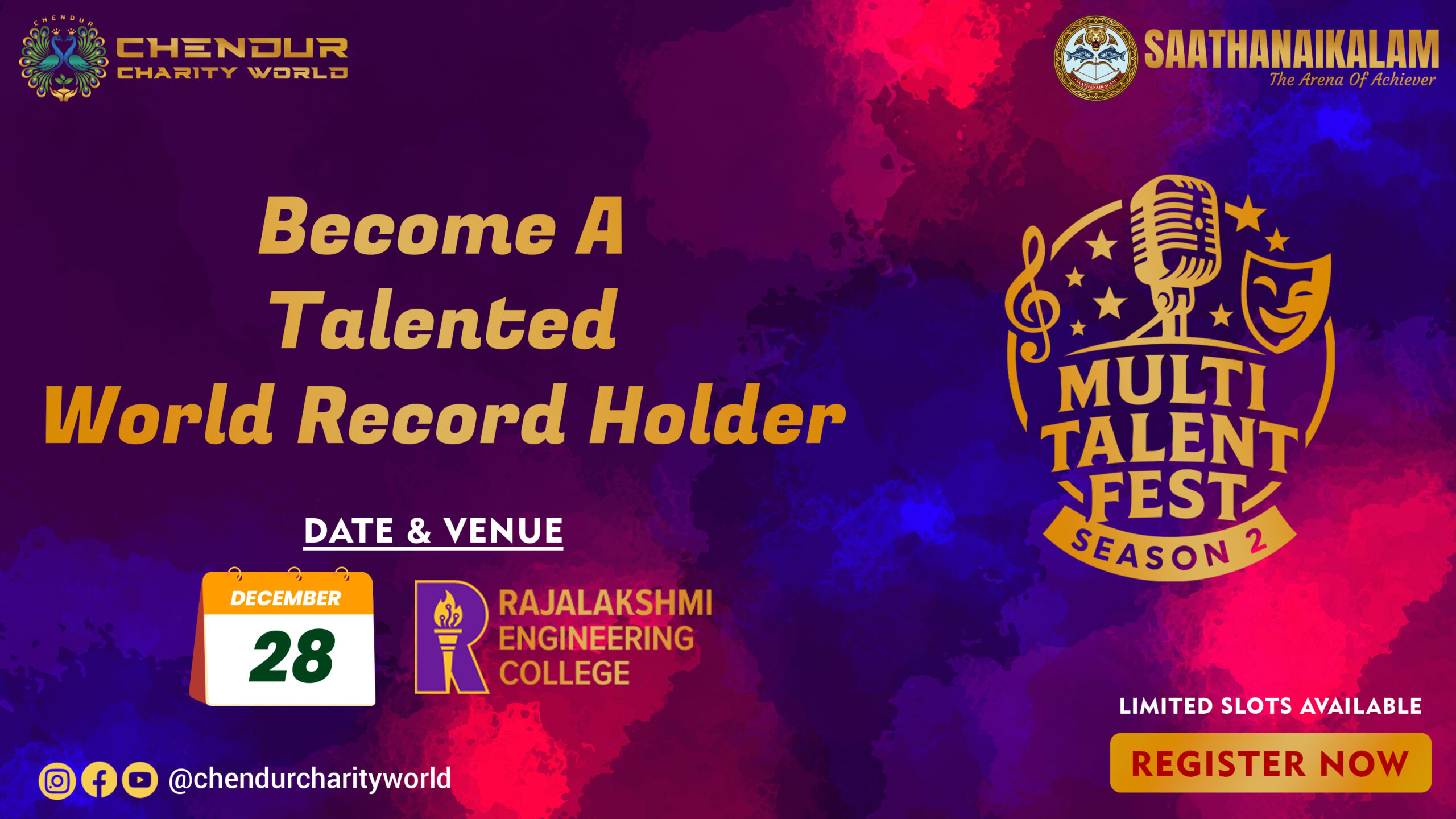 Saathanaikalam 25 – Season 2 is a National-Level Multi-Talent Fest Contest bringing together extraordinary talents from across India — from school students to professionals, performers, and creators of all ages.